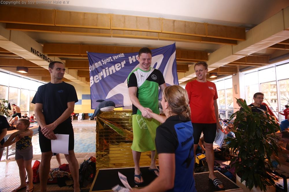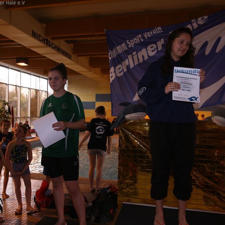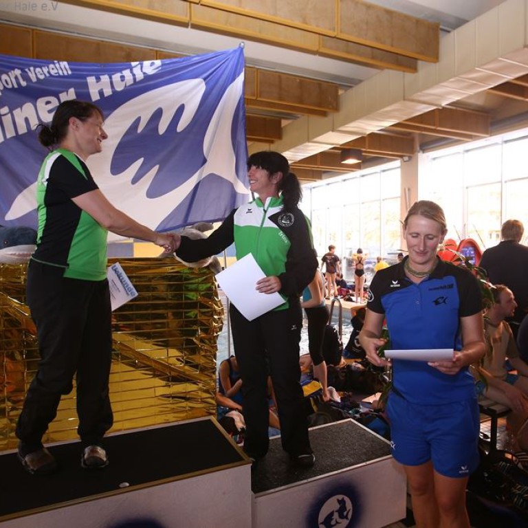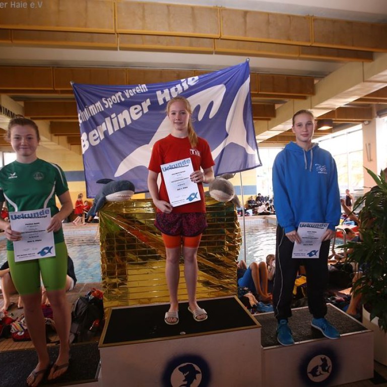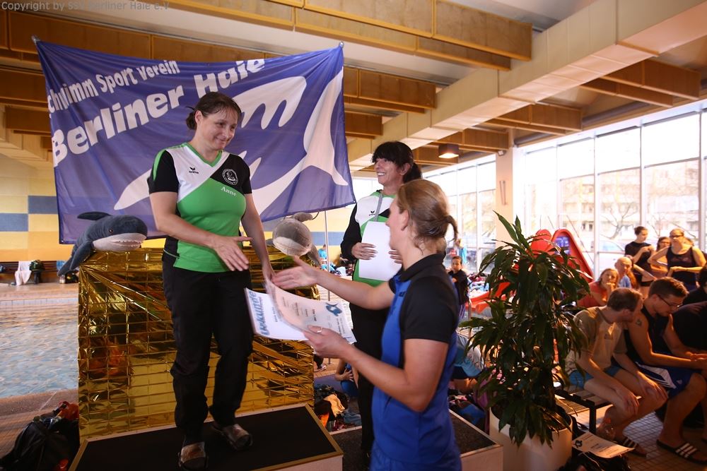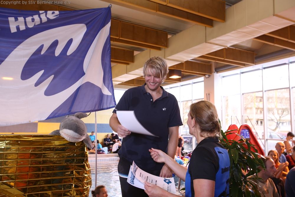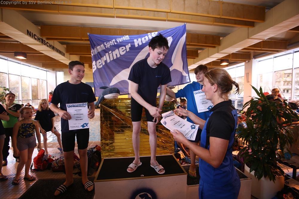 Nach dem ersten Teil des Wettkampfes findet eine Siegerehrung statt. Auf dem Treppchen sehen die Haie doch immer wieder gut aus.