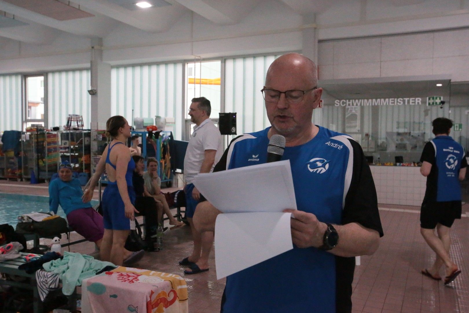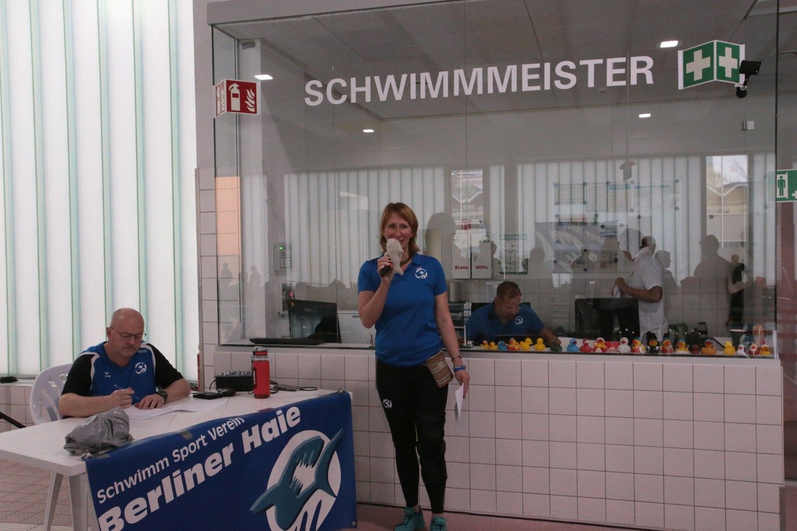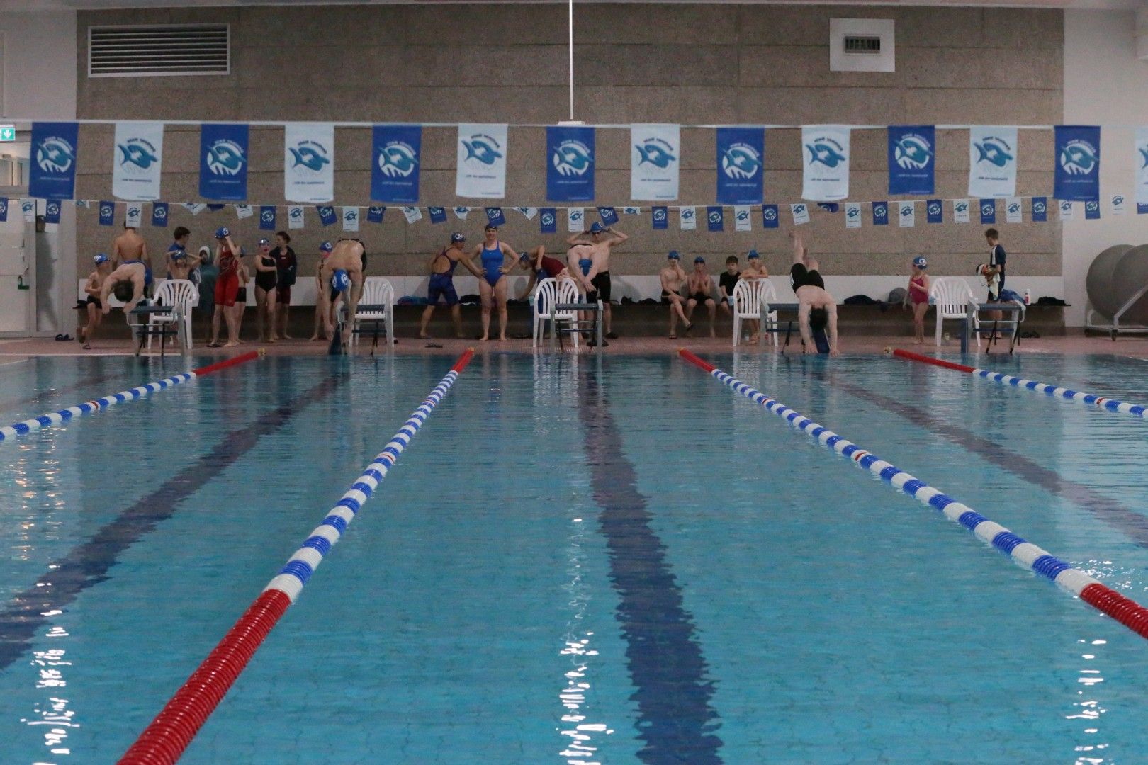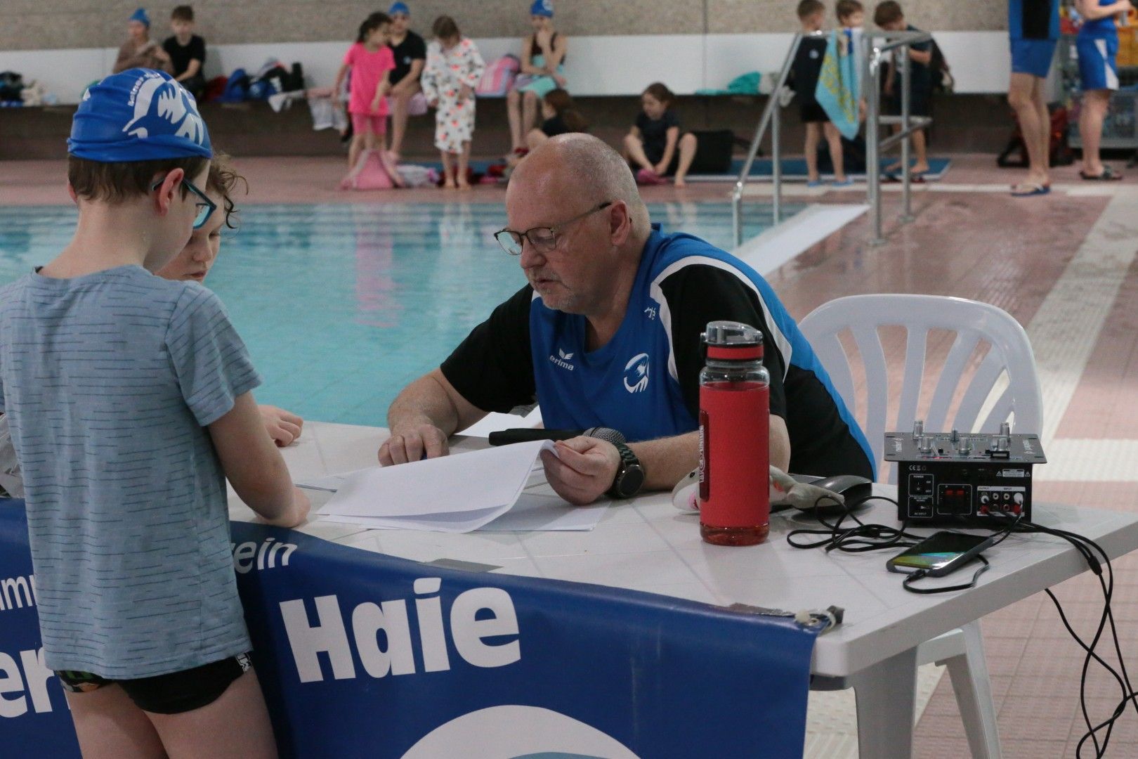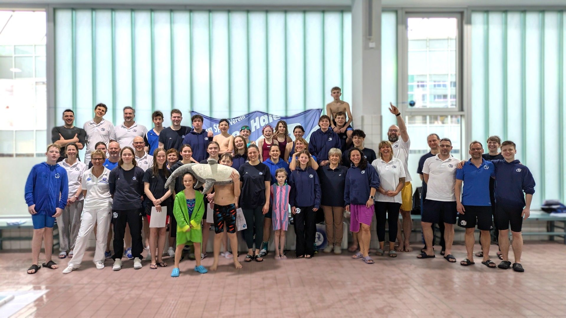 Am 15. März war es endlich wieder so weit, unsere diesjährigen Vereinsmeisterschaften standen an. Schon bevor um 09.30 Uhr der Einlass für alle Haie begann, waren einige fleißige Haie vor Ort, um die Halle wieder in echte Wettkampfstimmung zu bringen. Haiefähnchen wurden an der 5 m Markierung aufgehängt, Musik aufgebaut, das Podest vorbereitet und natürlich auch die Starttechnik eingerichtet. So wurde aus der normalen Schwimmhalle Schritt für Schritt wieder eine richtige Wettkampfarena.