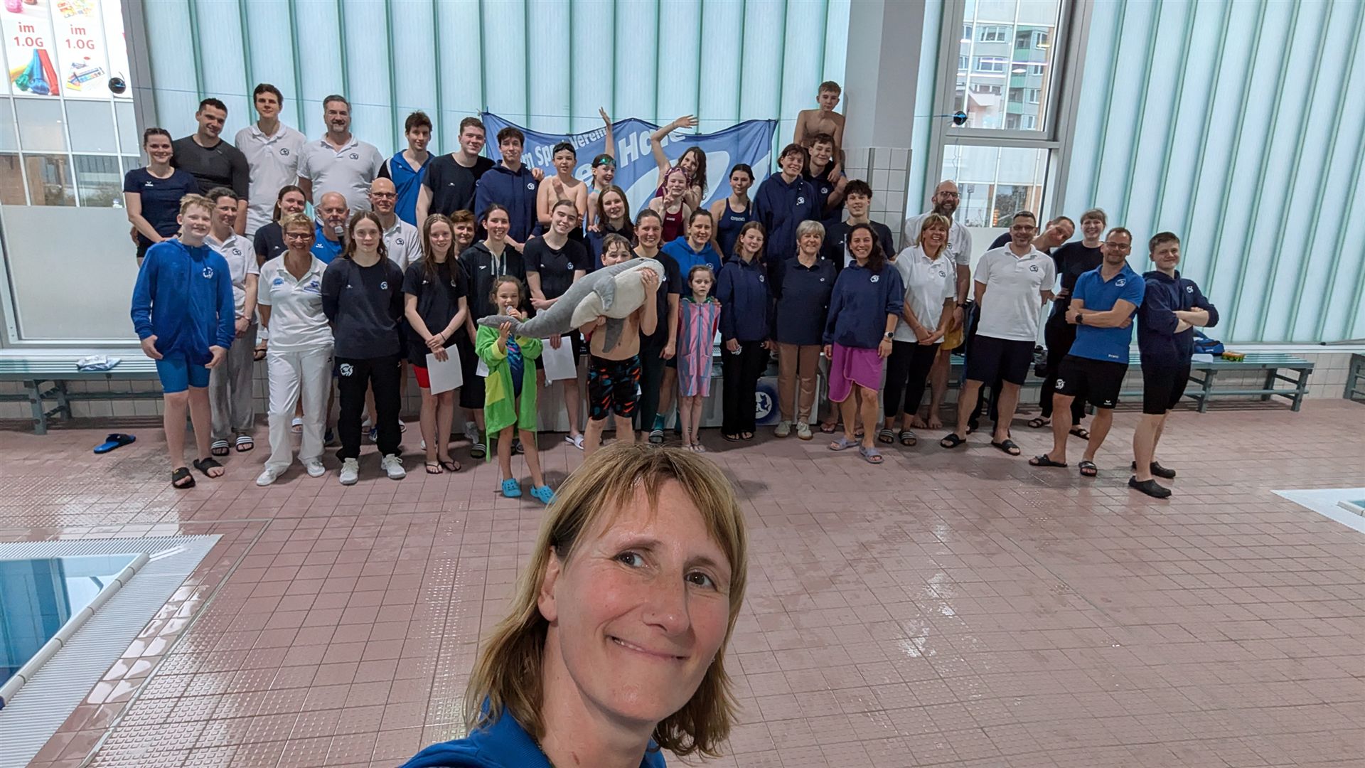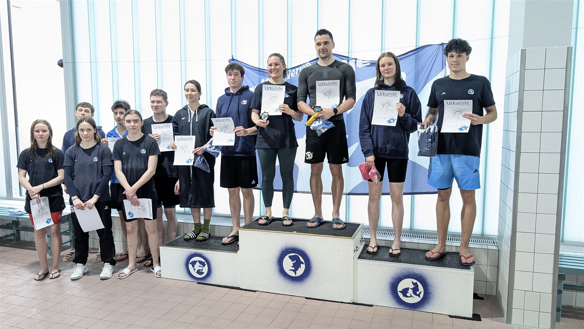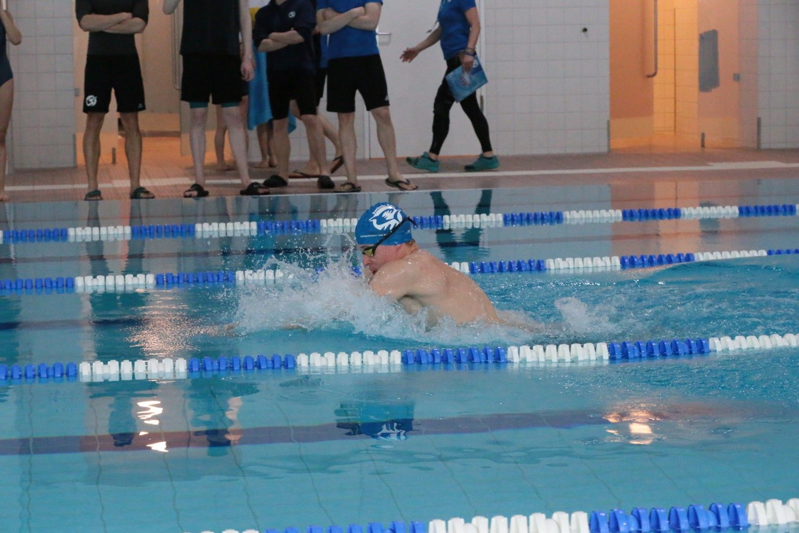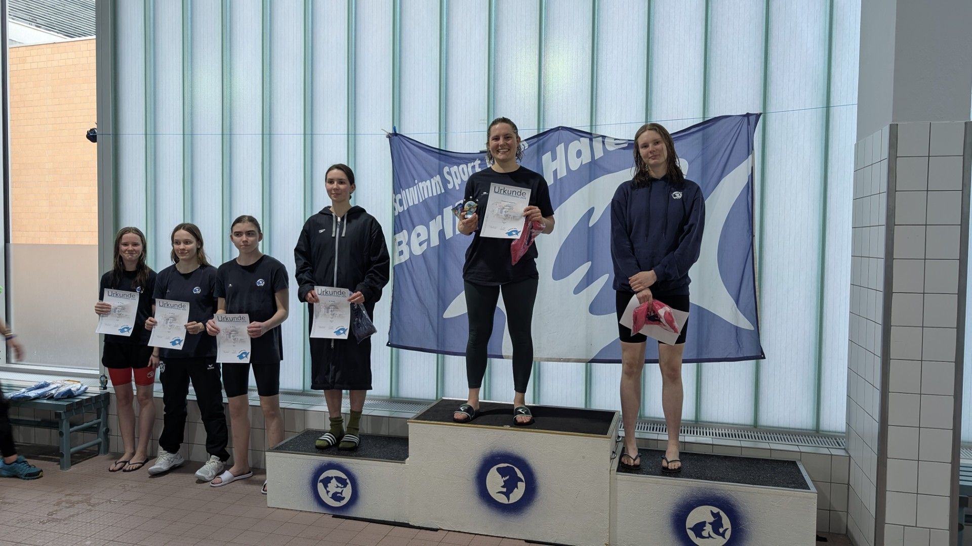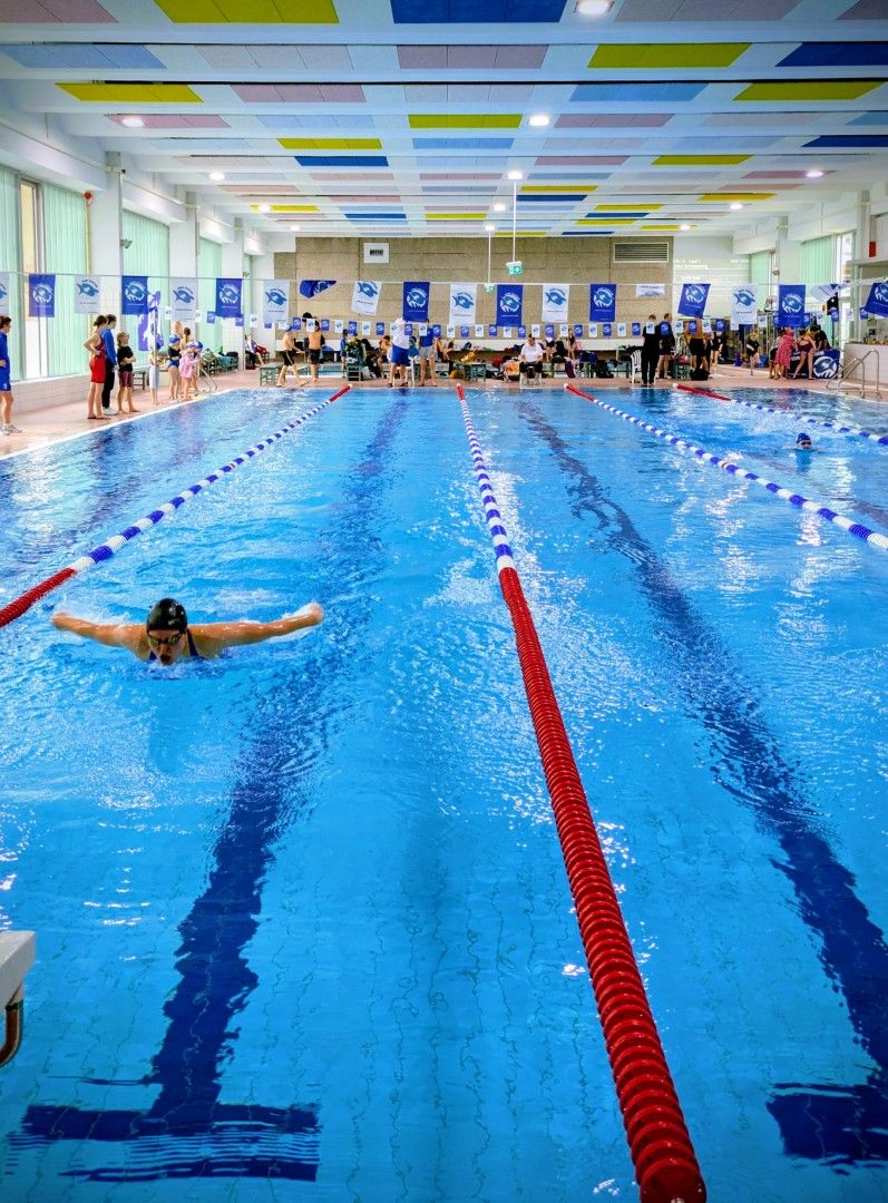 Als dann endlich die Türen aufgingen, waren alle Haie hungrig auf den Biss nach Bestzeiten, Urkunden und guten Platzierungen. Das erste Ziel war für viele klar: schnell in den Umkleiden einen freien Schrank ergattern. Danach ging es direkt ins kühle, enge Nass zum Einschwimmen, um sich auf die bevorstehenden Rennen vorzubereiten.