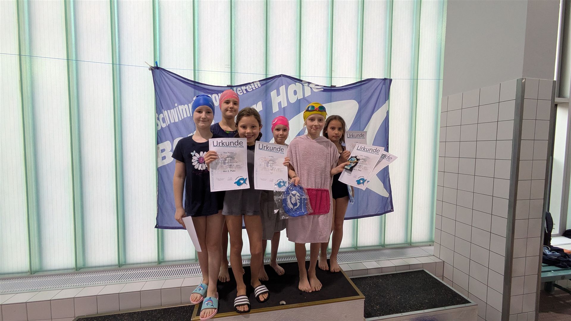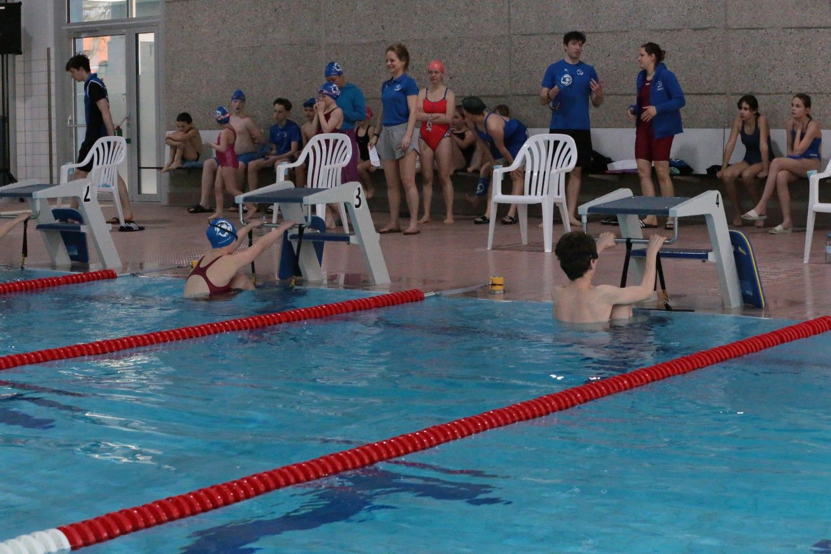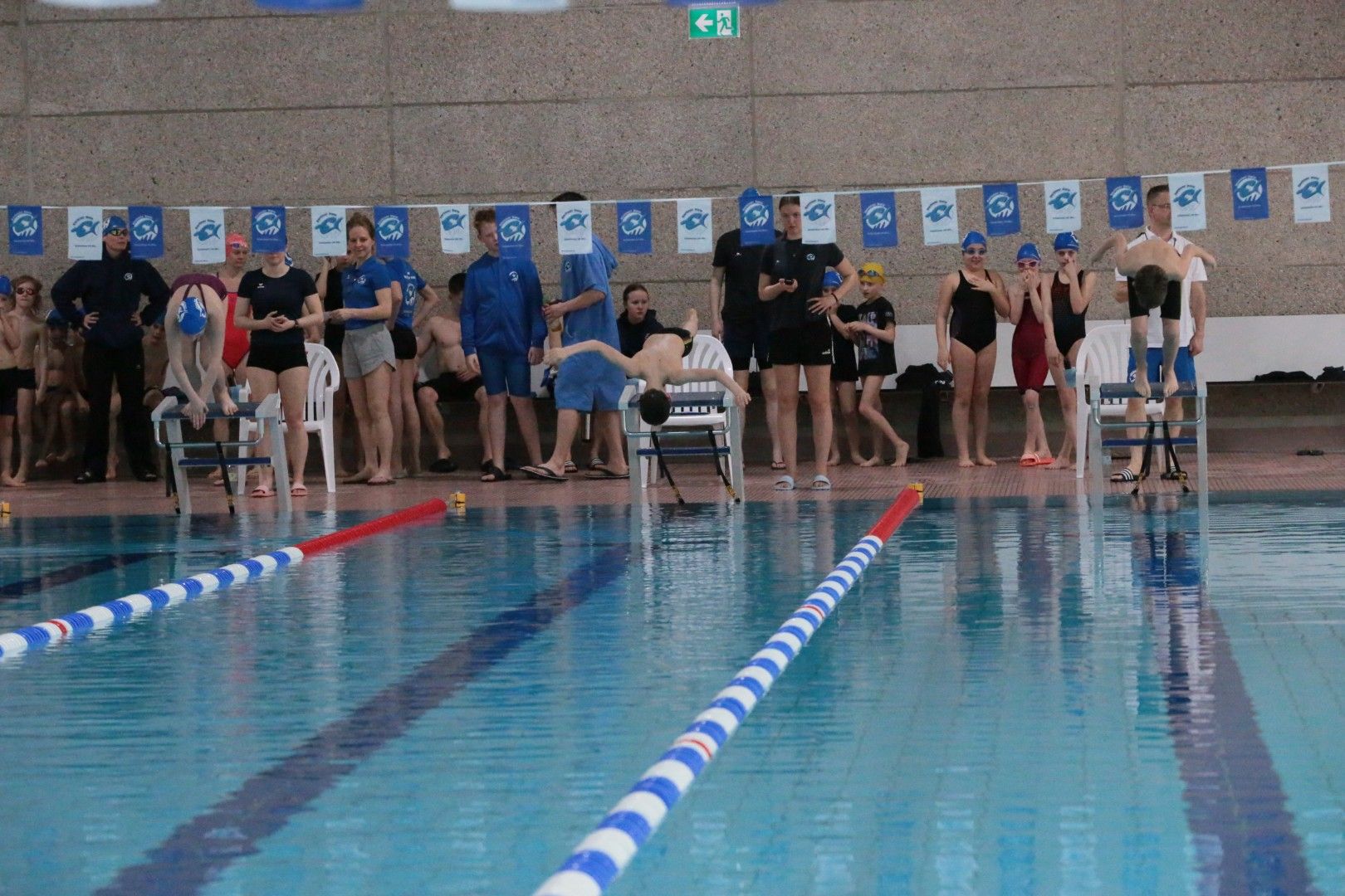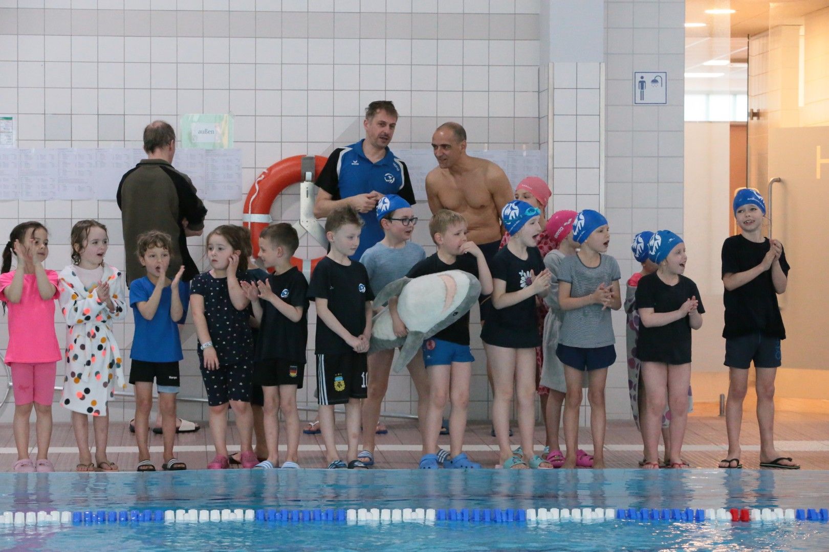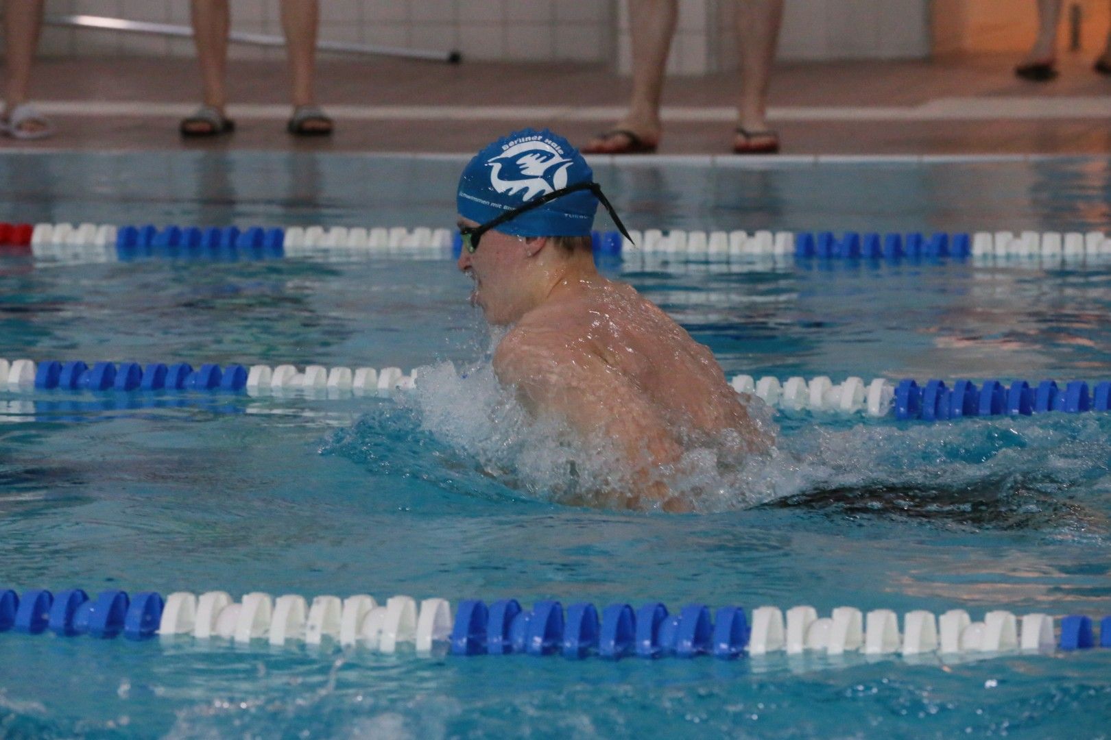 Als dann endlich die Türen aufgingen, waren alle Haie hungrig auf den Biss nach Bestzeiten, Urkunden und guten Platzierungen. Das erste Ziel war für viele klar: schnell in den Umkleiden einen freien Schrank ergattern. Danach ging es direkt ins kühle, enge Nass zum Einschwimmen, um sich auf die bevorstehenden Rennen vorzubereiten.