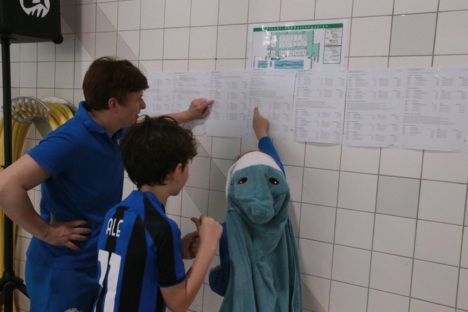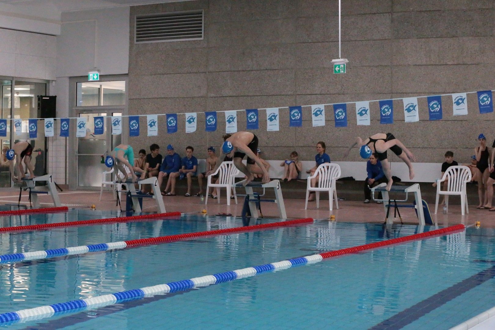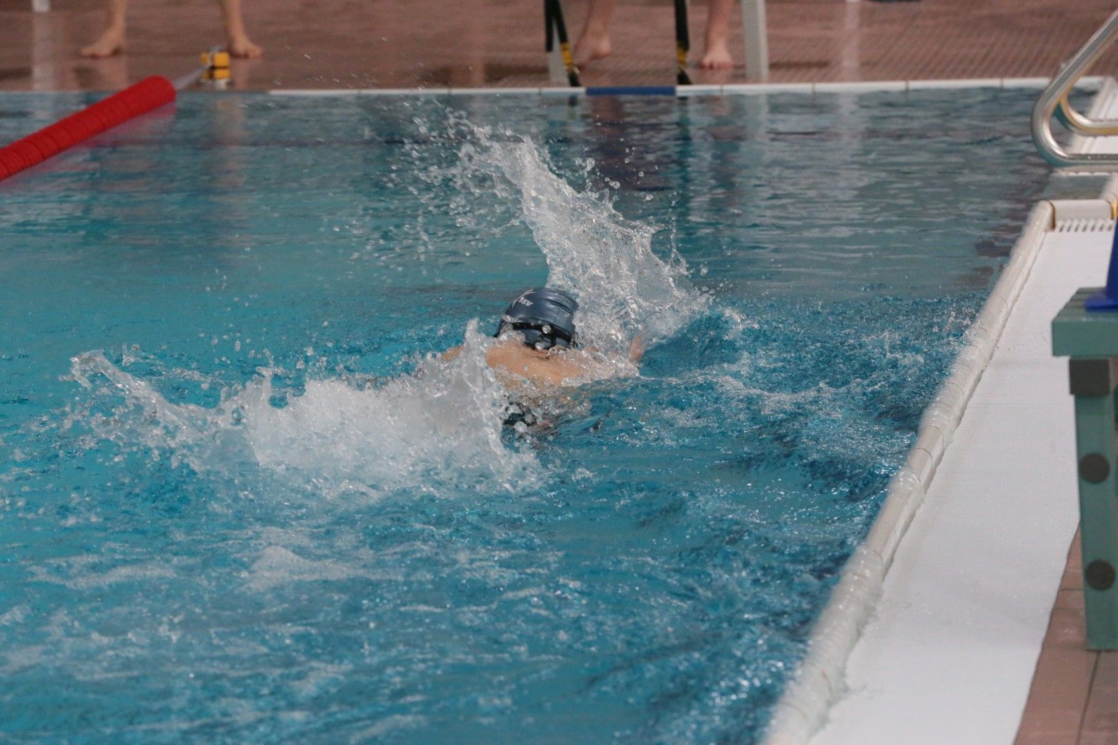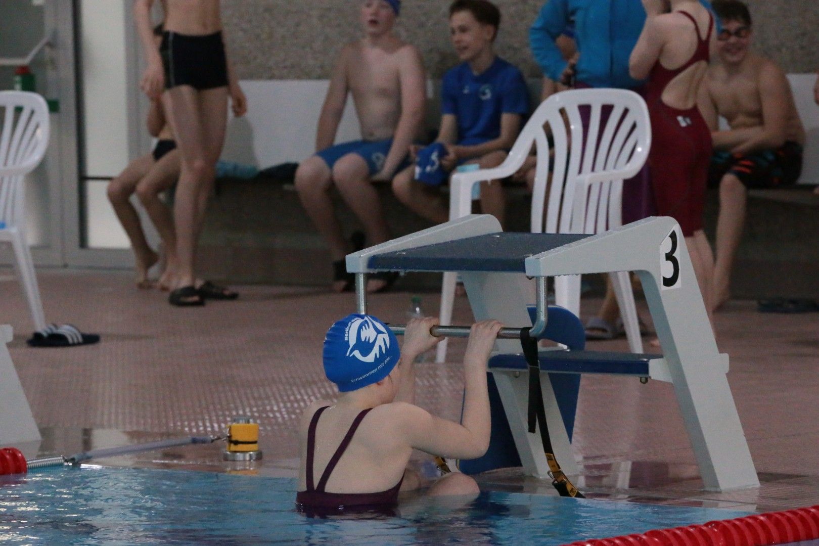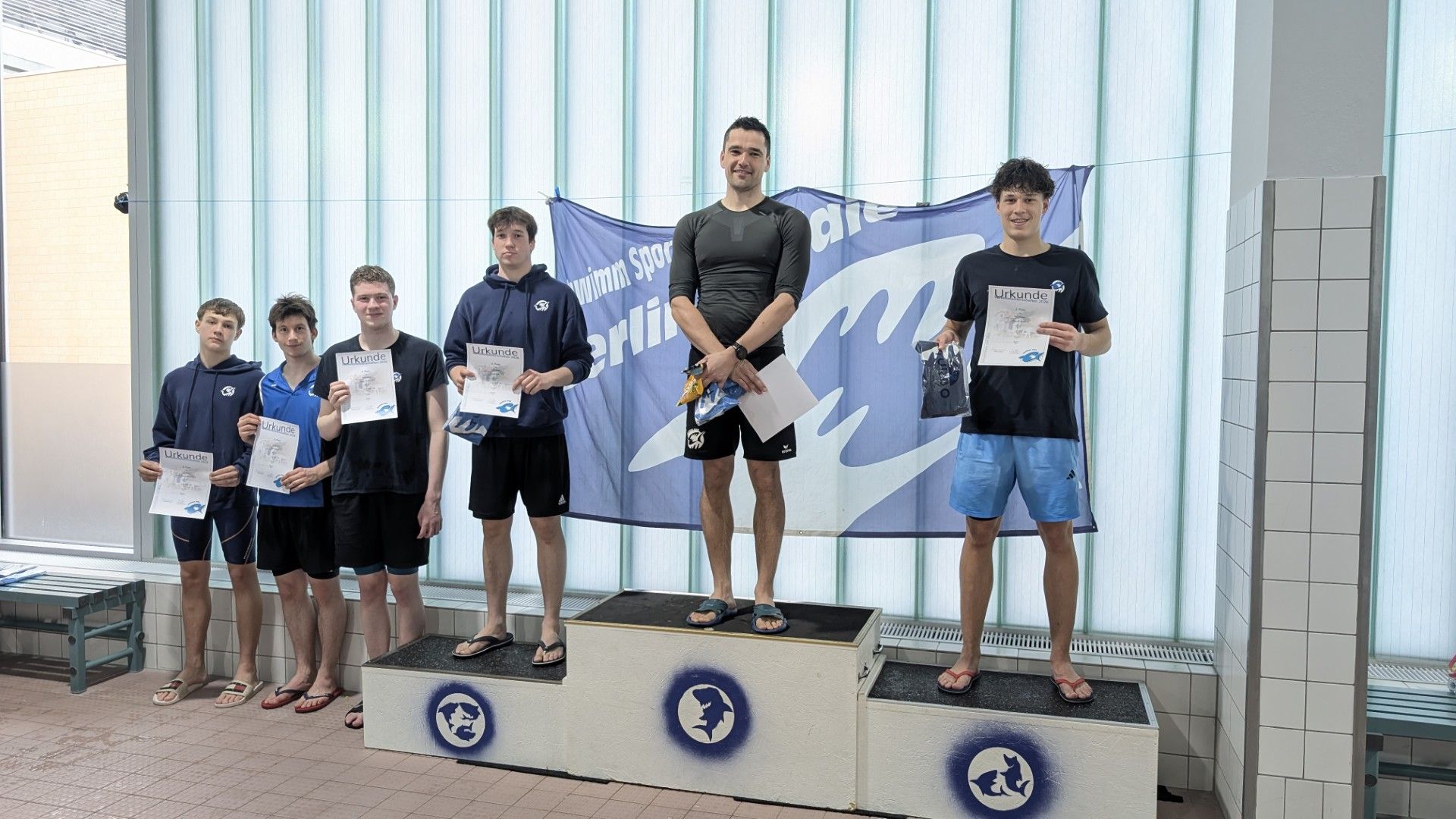 Als dann endlich die Türen aufgingen, waren alle Haie hungrig auf den Biss nach Bestzeiten, Urkunden und guten Platzierungen. Das erste Ziel war für viele klar: schnell in den Umkleiden einen freien Schrank ergattern. Danach ging es direkt ins kühle, enge Nass zum Einschwimmen, um sich auf die bevorstehenden Rennen vorzubereiten.