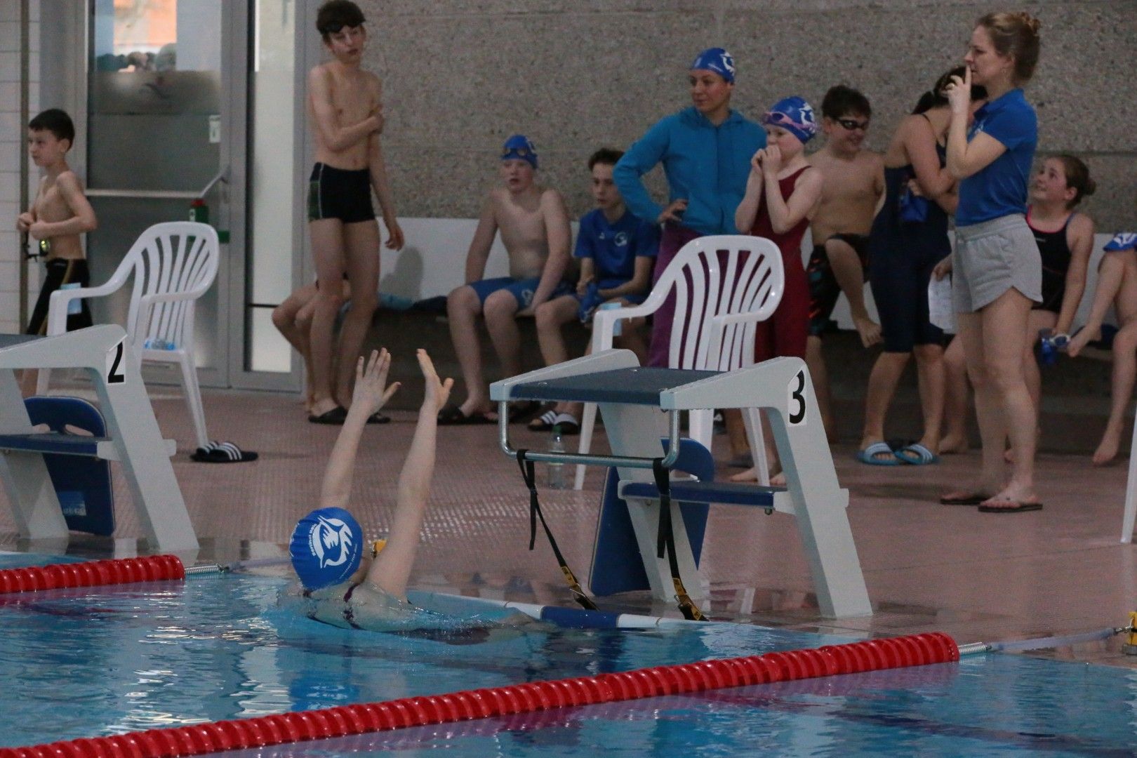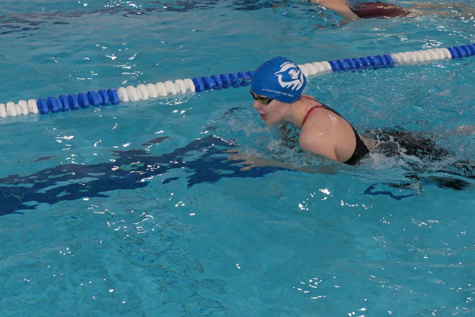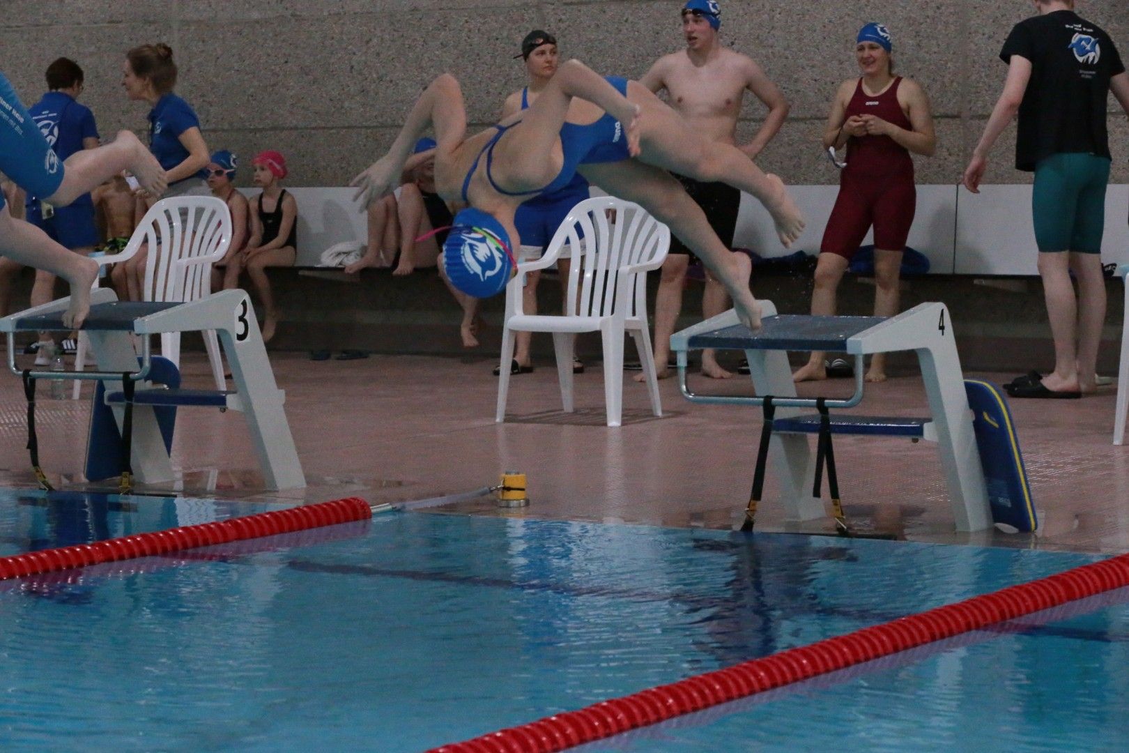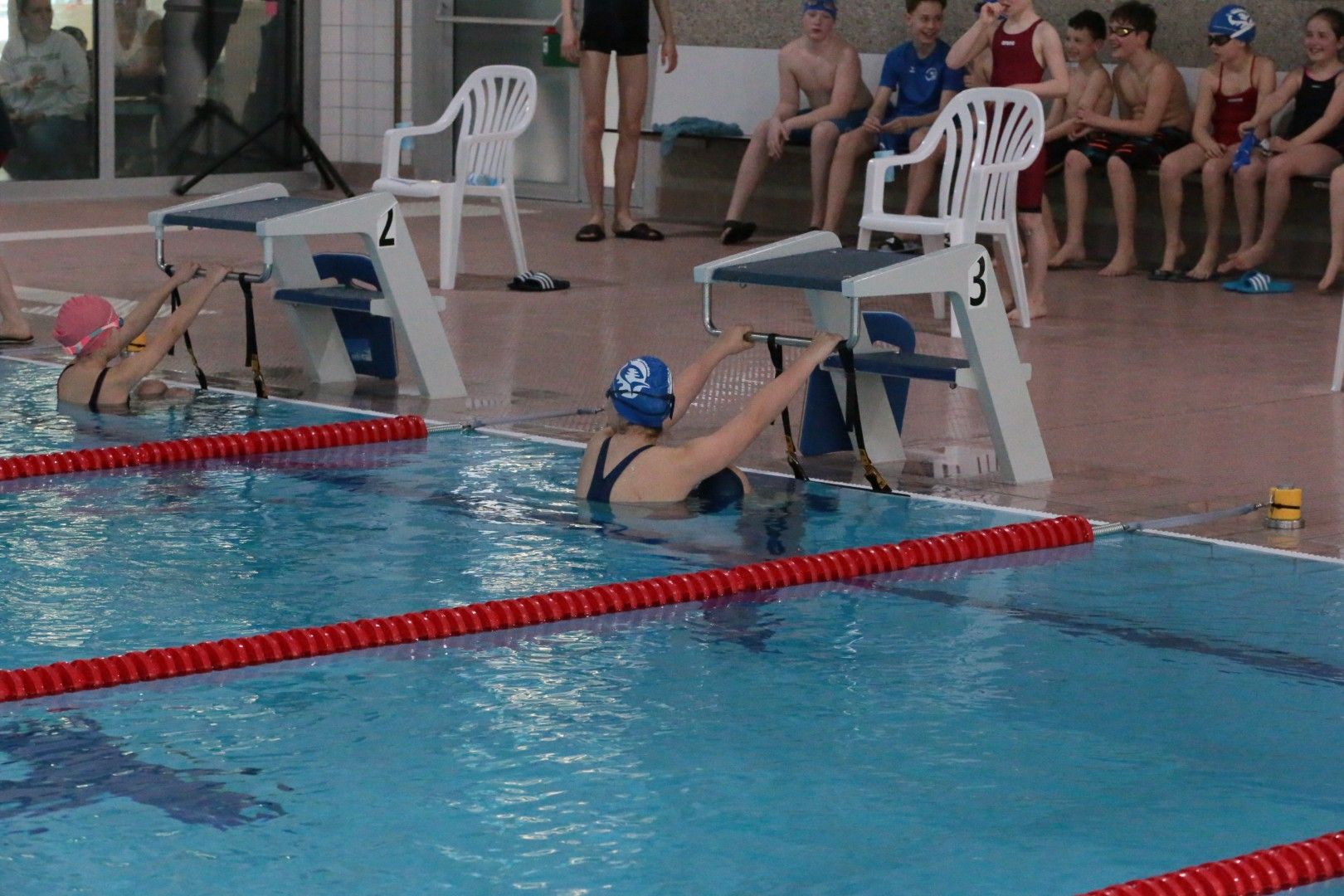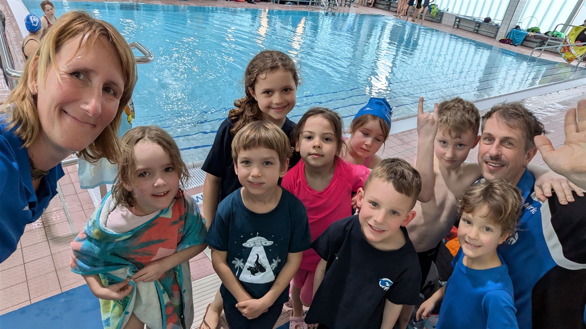 Als dann endlich die Türen aufgingen, waren alle Haie hungrig auf den Biss nach Bestzeiten, Urkunden und guten Platzierungen. Das erste Ziel war für viele klar: schnell in den Umkleiden einen freien Schrank ergattern. Danach ging es direkt ins kühle, enge Nass zum Einschwimmen, um sich auf die bevorstehenden Rennen vorzubereiten.
