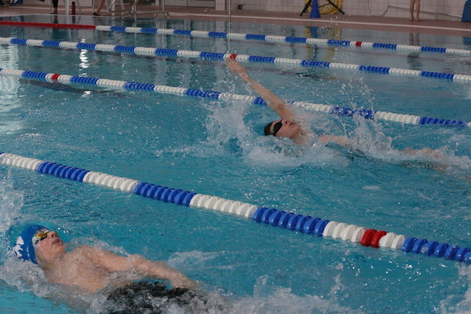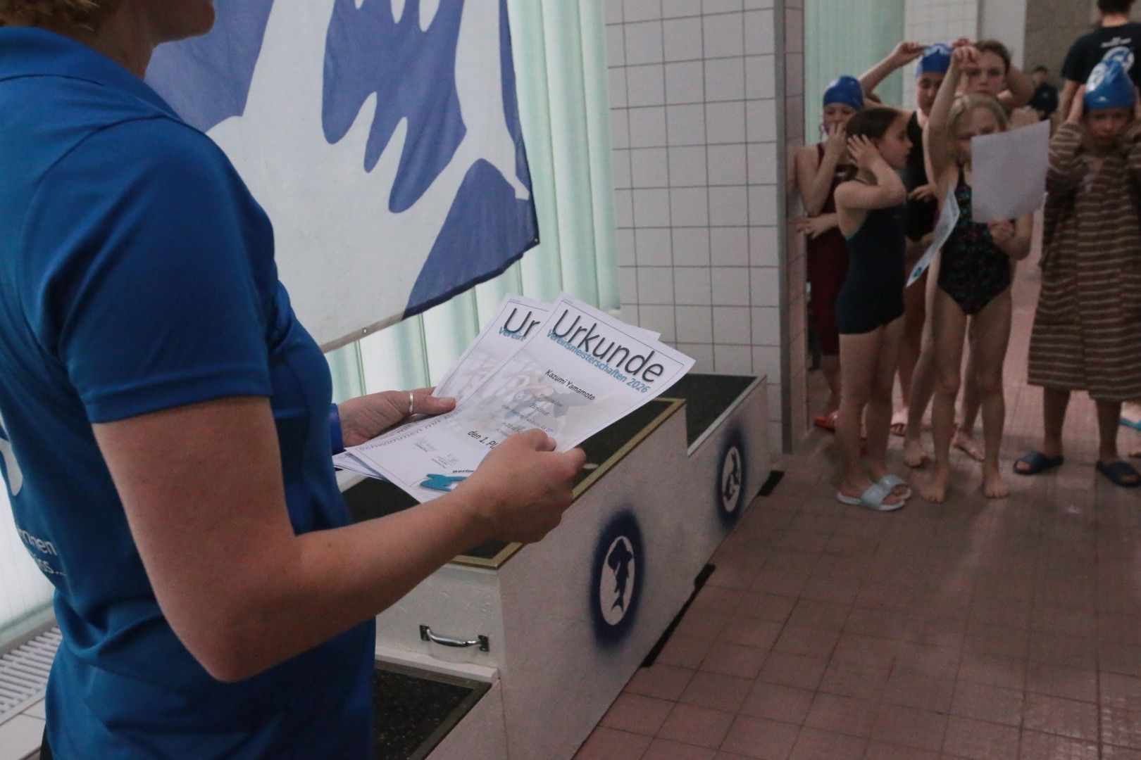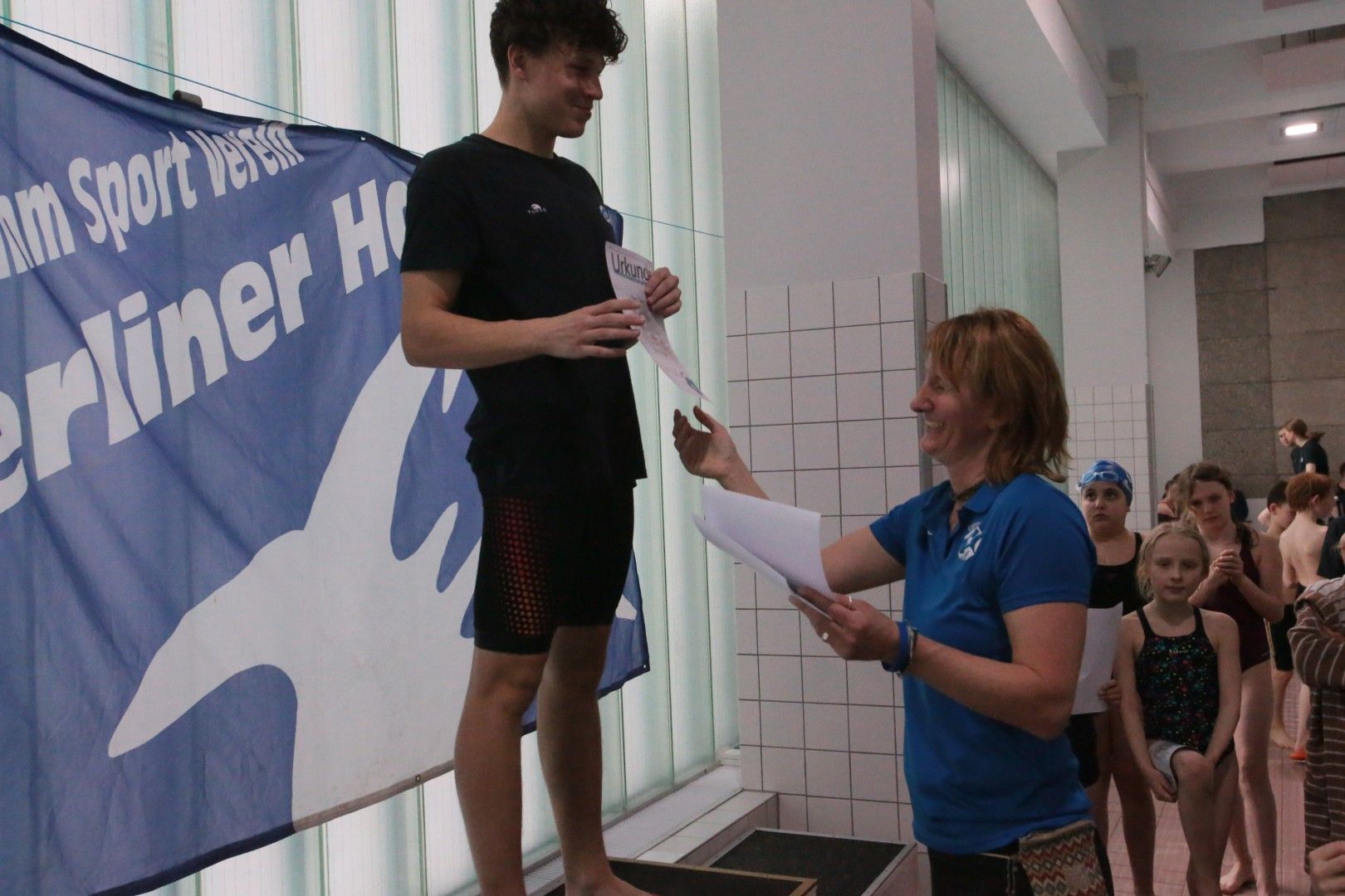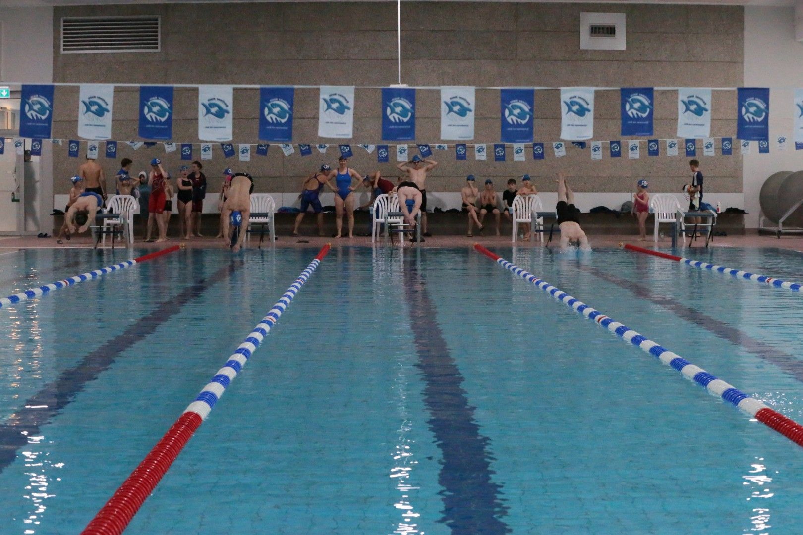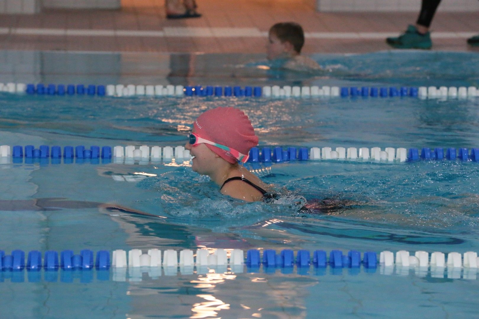 Als dann endlich die Türen aufgingen, waren alle Haie hungrig auf den Biss nach Bestzeiten, Urkunden und guten Platzierungen. Das erste Ziel war für viele klar: schnell in den Umkleiden einen freien Schrank ergattern. Danach ging es direkt ins kühle, enge Nass zum Einschwimmen, um sich auf die bevorstehenden Rennen vorzubereiten.
